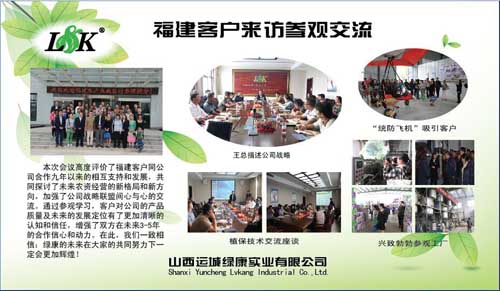 為加大客戶與公司之間的信任度,增加銷量,2014年9月23日,閔北區(qū)業(yè)務(wù)經(jīng)理陳鋒帶領(lǐng)福建客戶來綠康公司參觀學習,由技術(shù)總監(jiān)薛工帶領(lǐng)大家參觀生產(chǎn)工廠。首先參觀了我公司用于統(tǒng)防統(tǒng)治的美國三角翼,為了貼合******統(tǒng)防統(tǒng)治的植保理念,為了提高防治病蟲害效果,綠康公司于2012年成立了統(tǒng)防統(tǒng)治合作社,并購置美國原裝進口塔瑞斯MA-34R528XB農(nóng)藥噴灑飛機五架??蛻粼趨⒂^飛機后對公司先進的植保理念表示贊賞。